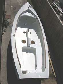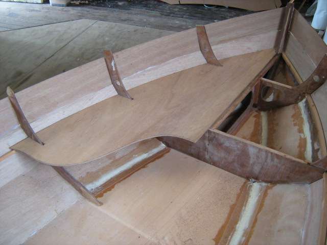 The inside of Varuna, Paul Grooms Pathfinder. Note the seating and the raised floor, all of which has to fit the sides of the boat, the motor well, transom, centre case and forward bulkhead. Good fits are not only good workmanship, they save bucks on epoxy filler too. |