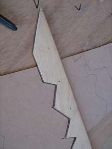 The jogglestick, it could be any piece of scrap with an odd shape cut in the side, but don’t make the notches even, they need to be sufficiently “odd” to make it obvious where it will sit when transferring the position of the points. |