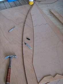 With all of the marks transferred, and the nails in place, bend a nice even batten around the nails and mark the edge of the piece to be cut. You may need to adjust a few nails a little, go for a fair curve and slightly bigger, you can plane this down if needed but its not so easy to add material.