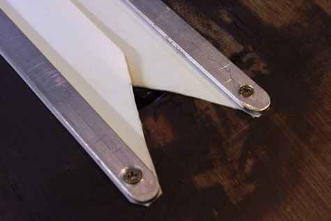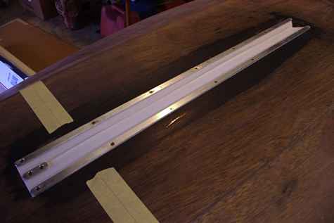 I started by marking out where the trunk logs are located and then marking those screws so I don't hit them when drilling for the gasket strips. I chose 1/2" aluminum strip that is 1/8" thick for the strips, and 1/2" X 6 stainless screws to hold them down. Of course part of the job was drilling and countersinking the aluminum strips for the screws - easy enough with the aluminum. The sail cloth was cut to 3-1/4" wide in my instance, and folded in half lengthwise to double it up. The fold goes to the inside of the slot. That puts the cut edges under the aluminum strips. I overlapped the gaskets about an 1/8" over each other in the center of the slot. At the back end of the slot the gaskets are cut at a 45 to leave a little triangle cutout there - the idea is that something of a venturi effect is created when the boat is moving to suck water out of the trunk. Even though the board went up and down with no binding whatsoever, I cut a small slot across the width of the slot at the front of the board to close up that gap a little when the board is deployed. The screw holes going through the sail cloth were made with the point of a nail heated up on a propane torch, and the sail cloth was cut with a new utility knife blade in my knife heated on the same torch. This is to seal the edges so they don't fray. I glued the sail cloth to itself where it is folded lengthwise so there is no space in between that fold that could balloon and fill with water and create unwanted drag.