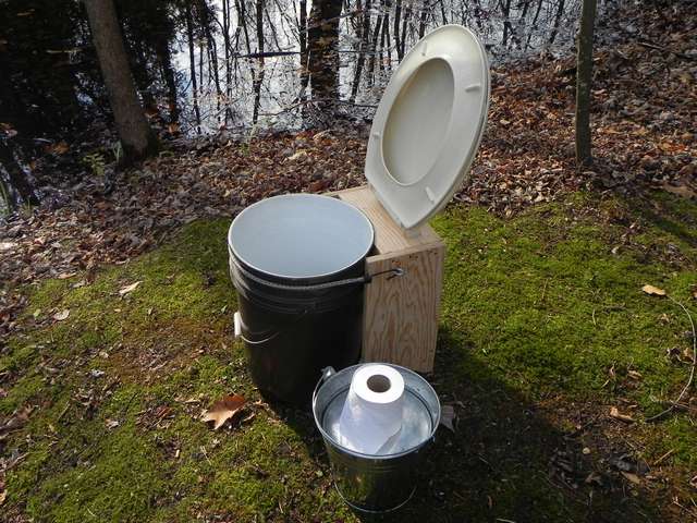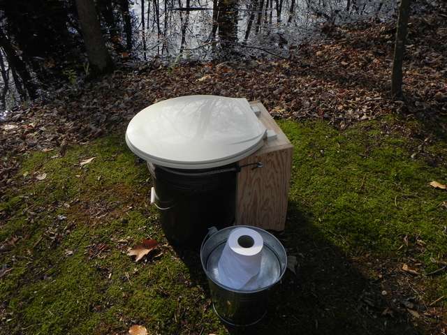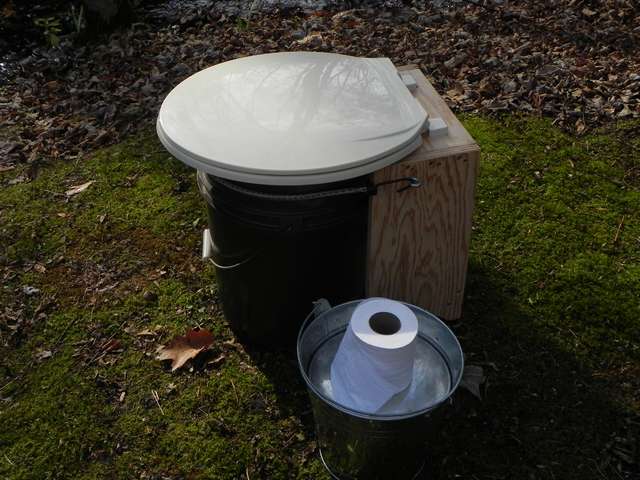 A simple ply box added to fit a pail, attach a regular household toilet seat for comfort and the pail becomes a functional toilet! Cheap Composting Toilet that is!