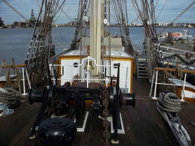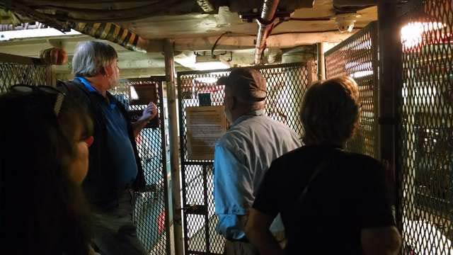 Up the gangplank, onto the ship we go. The foredeck is roped off to tours, but Jamie takes us through. Just inside the Forecastle is the crew cabin, a tight little space with narrow bunks and thin mattresses. A hatch in the floor is unlocked, and we squeeze down a narrow ladder into the bowels of the boat. The first of many fans is running, battling the damp that in this environment will always be waiting. We can see the inside of the hull, rivets and welds, patches and pieces. Not sure I would want to be down here when underway!