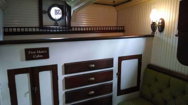 Under the deck of the stern are the quarters of the first and second mate and the captain. Small spaces but a bit more than that afforded for the crew. Some of the original paneling and trim is here as well.