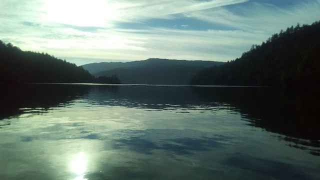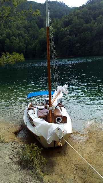 On the way to Mill Creek Falls I noticed a promising deep cove that I decided to explore for a good stopping place for an afternoon swim. I found a wonderfully sloping rock perfect for my shallow draft boat complete with a stone place for stepping off the boat dry footed. My wife found a “spa bench” at a perfect height in the water for a relaxing soak. The high bank above my impromptu boat slip had some man-made steps leading to a flat topped peninsula with signs of a campfire and, sadly, some bits of food trash. Evidently, some stealth camping goes on especially at such a secluded spot out of view of the rest of the lake. We were so relaxed that we decided to just stay the night in this secluded spot so cleaned it up a bit and relaxed. About sunset we witnessed a parade of boats heading back down the lake to the state park then the lake got really quiet except for the sounds of nature around us. If there hadn’t been some light clouds in the sky, I am sure we would have been treated to a wonderful tapestry of stars. Dinner consisted of reheating some pre-made chili and as the night cooled we got situated for our first night sharing the small cabin on this fourteen foot boat. Before turning it, I noticed the boat was becoming rather hard aground and at an angle so, with my wife’s help, I backed her down the slope a bit but kept a good portion of the bow grounded. The night passed swiftly with both of us being surprisingly comfortable in the small confines probably due to the cabin splitting centerboard trunk.