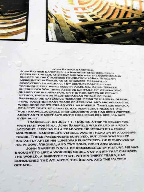 After the formal tour, Kodros graciously spent some time answering questions about the two ships. They are owned by the Columbus Foundation, which is based in the British Virgin Islands. The original goal was to build the vessels to commemorate the 500th anniversary of Columbus' 1492 original voyage. At first, only enough money could be raised to build the Nina and construction started in 1988 in Valencia, Brazil, using traditional techniques and only hand tools. John Patrick Sarsfield, an American engineer, marine historian, and expert on caravels, was hired to oversee the project. He was tragically killed in a car accident in Brazil in 1990, a year before Nina was completed. The Pinta was completed in 2005 with money raised by Nina's tours.