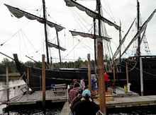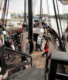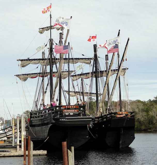 The curious, in jackets, t-shirts and bright colors, flowed over the decks of the two black-hulled ships, the most colorful bits on a day when the sun only peeped through the clouds. They waited, sometimes two or three hours in line, for a chance to see these two replicas of history, traditionally constructed presentations of the Nina and Pinta, two of the three ships Christopher Columbus sailed on his discovery voyage to the New World.