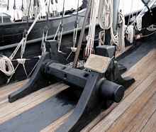 The hulls are black, Kodros explained, because in 1492 the ships would have been covered in sticky, black, flammable pine tar to help in waterproofing and fighting hull-eating worms. The 65-foot Nina displaces 75 tons and carries 20 tons of ballast stones. (Pinta is 85 feet and 101 tons. The third ship of Columbus' fleet and the largest, the Santa Maria, has not been rebuilt. It was wrecked on Columbus' initial voyage, forcing him to leave some of his crew before returning to Europe. They had disappeared when he returned on his second voyage.) The rudder extends seven feet into the water and is steered with a giant, deck sweeping tiller. Kodros noted that wheel steering had not been invented in Columbus' time.
