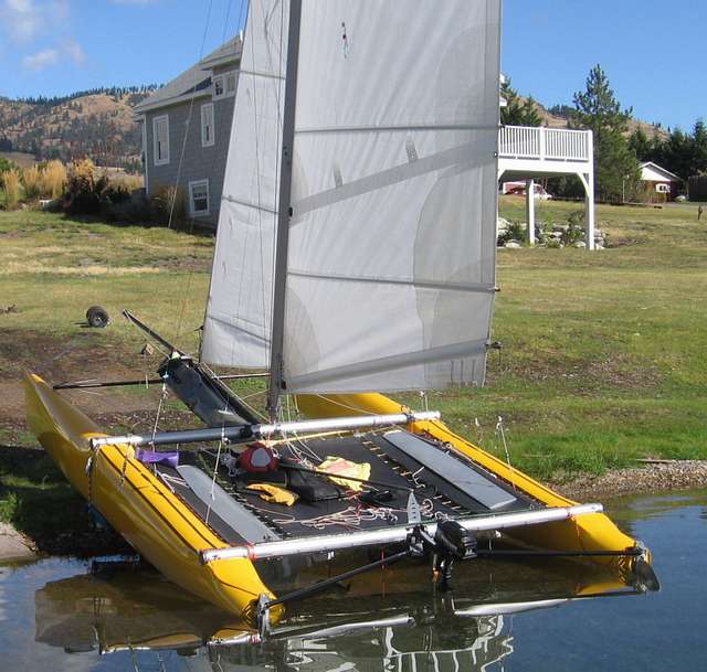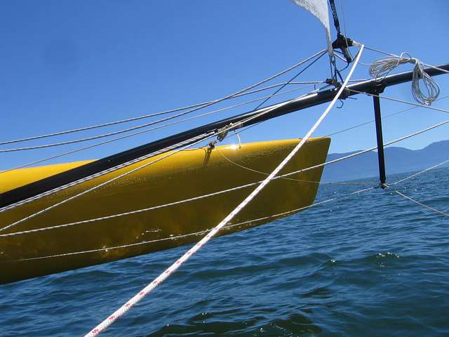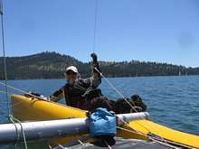 Brad rouses me from a fitful slumber at 7:30 the next morning. It's just getting light, blowing maybe 10 to 15 now. It was still in the high 20s most of the night, I could hear the surf from the cabin whenever I awoke. Reed picks us up at the dock 15 minutes later, and we motor into the adjacent bay. There she lies, disturbingly bow up. Either the mast is on the bottom, or there's a lot of water in the sterns. Both, it turns out. But after some frustrating untangling of the mass of lines entwining the boat, we again attempt to pull her bows over sterns, and she pops right up. A measured tow back home, a slow pull up the beach to allow the hulls to drain, a little breakfast, and a couple hours later she's on the trailer and headed for her winter digs. A few dollars, a bit of love, and the Lunatic Fringe will once again challenge Flathead Lake.