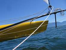 Normally she'll lie there on her side while we scramble onto the lower hull and hook into the righting line. But that sucker lull is long gone now, and 20 kts of breeze pounding on the tramp rapidly drives the mast into the lake and the boat turtles, completely inverted, before we get into position to right the boat. Turns out she's a mighty stable platform upside down, even in this building sea. We're in dry suits, so personal safety's not an issue. But getting her righted before we drift ashore and that 40 mast finds the bottom is a high priority. It's now blowing in the high 20s with increasing chop, it's mid October and there's nary another boat on the lake. We spend some time and precious energy attempting to pull her up from turtle, but the 12' beam that makes her so stable pointy end up, now performs similar duty now keeping her inverted. Out comes the cell phone, to acquaint us with how many of Brad's numerous boating buddies have pulled their boats for the year. With the best offer of assistance being hours away, we once again put some muscle into doing the job ourselves. The boat has altered it's orientation to the wind, and somewhat surprisingly we get her onto her side, but can't quite pop her back upright. Big windage now, and with the sails substantially less immersed, we're drifting ashore rapidly. And a formidable shore it is, big rocks with a three to four foot swell pounding it. And we've got to stay on the righting line to keep her on her side, or the mast responds to gravity again.