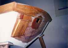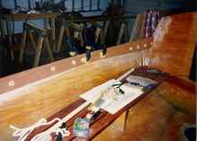 The guides for the drop boards are roughed-in, and you can also see the top trim of the daggerboard trunk roughed-in. The drop board guides were pre-shaped before they were glued-on, but the daggerboard top trim was glued-on somewhat rough, then shaped in place, to make sure it was faired into the trunk, and where it met the drop board trim along the main bulkhead. |
