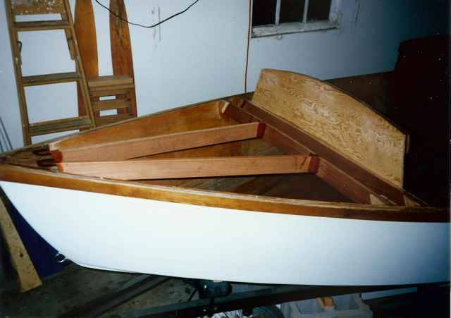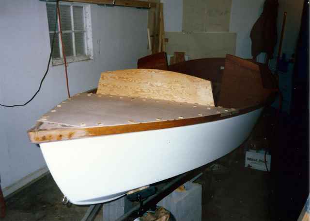 You can see the extra foredeck beam I added to support the deck-stepped mast. The plans called for a keel-stepped mast, but I thought this would be way too hard to raise and lower, and it would have been. I added shrouds and a forestay to support the mast, and later added a tabernacle. I should also have reduced the mast diameter from three-and-a half to three inches, since it didn't need to be nearly as strong as the original design, but didn't think of that at the time. |