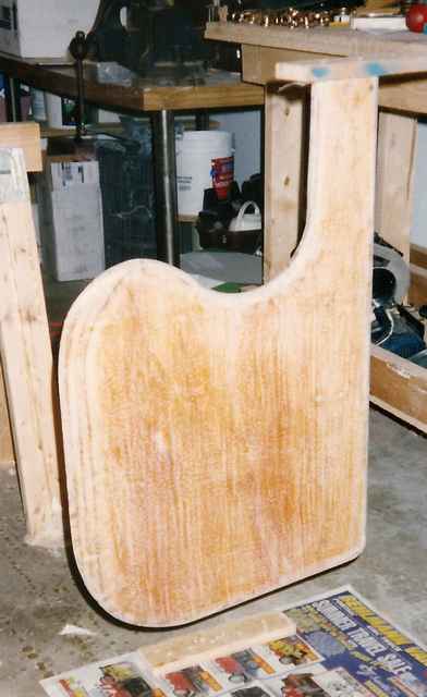 This was prototyped with a plywood template before cutting the andiroba. Most clamping was done with drywall screws through 1-inch squares of 1/4-inch plywood pads, with 1-inch squares cut from a heavy plastic bag to prevent glue-on. Occasionally the drywall screws would get glued-in and snap off. These were drilled-out with great difficulty, using a piece of brass tubing as a hollow bit. |