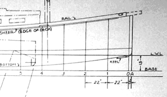 First the height (Z). The 1st row of that column is named “heights” LWL to sheer. This is the height at the sheer, above the LWL. It is marked 1-10 (22”) BUT it is measured from the LWL. The LWL is 15” above the BL (see the plans) and we will adjust the heights from LWL, in this case, add 15”. This means, height above BL = 22+15 = 37”. Z = 37. Yes, Atkins moves his coordinates, get used to it! He uses the LWL for the sheer height then decides to use the baseline for the chine.