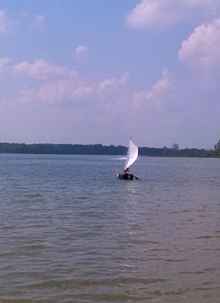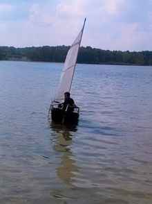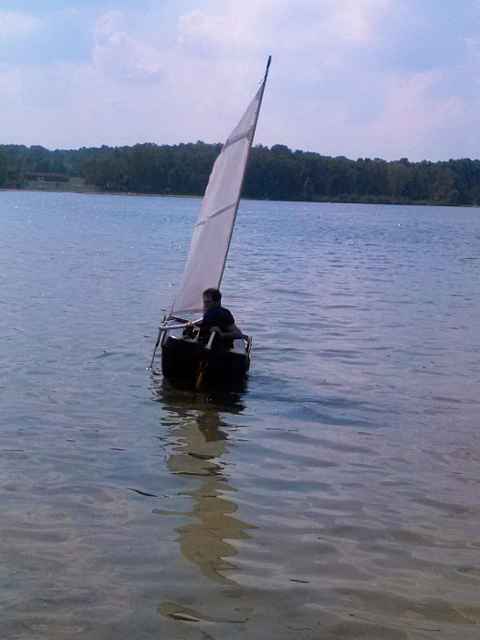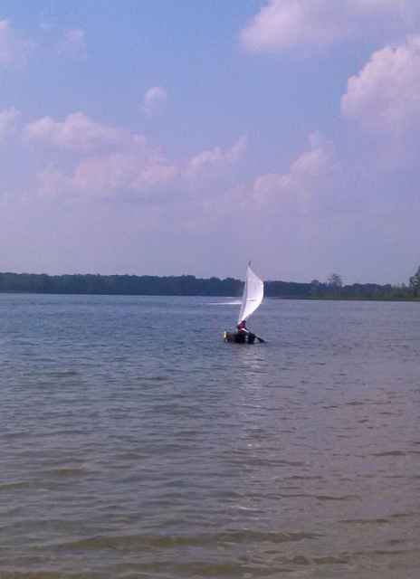 The boom needs to be aluminum tube, clew needs better lashing, but course holding and way on in wind from sparrow flying across lake. |