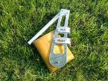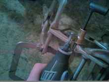 Finished rudder. Aluminum pintles with stainless steel bolt pins, cable clamp U bolts holding. PVC tiller.