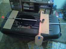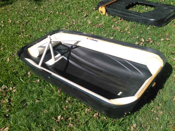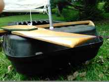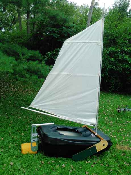 This is the Sears cartop carrier being transformed into a worthy sailboat. Seems Sears may label all their carriers "X-Cargo", but this may be their biggest: 66" LOA x 36" wide. The front will form a scow bow, and the carrier's height will make a lot of freeboard - about 16". The finished craft will be quickly convertible to a kayak, and is made of the same tough polyethylene. If we get these boats any shorter, somebody's going to have to start a stand-up class.