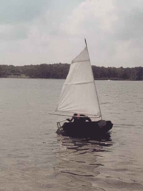 PVC tubing provides lightweight strength and air chamber floatation. Structure at bow is mast step. Background shows deck and lee board mount/swivel plate.