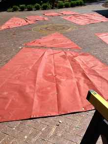 Beautiful tanbark sails, courtesy of Duckworks, laid out on the driveway. |
