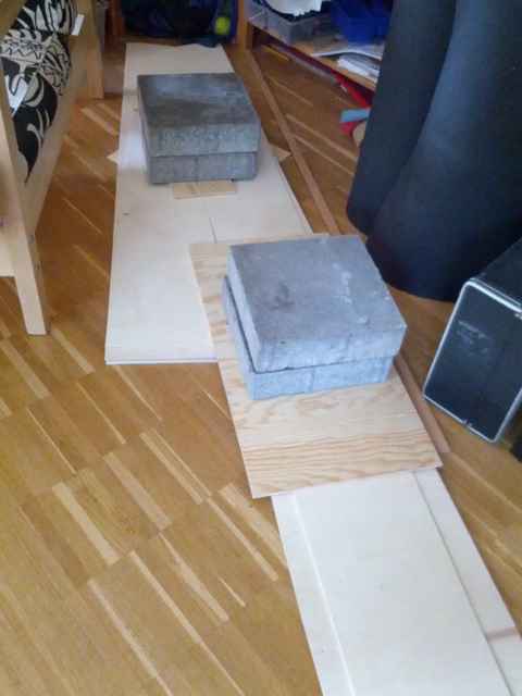 Sstack of parts curing with some concrete blocks to keep it flat. |
