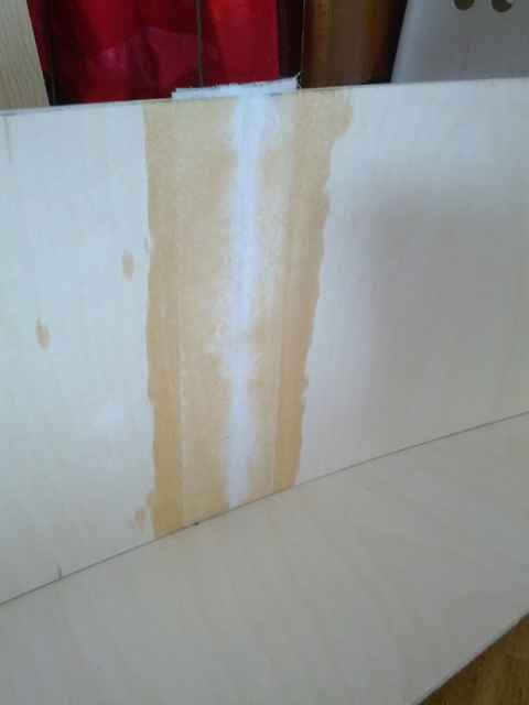 Then, I joined the middle panels to the shorter hull section for both sides. Used a two-sided glass tape butt joint. True to the "all cheap" philosophy mentioned above, I used drywall glass tape for the butt joints as well as for the reinforcement patches. The stuff is nice and flat, cuts with scissors like paper but is fairly stiff. I am curious to see how it will work on curved fillets. For curing, I stacked all parts flat, with non-stick plastic sheets between the epoxied spots. Put a few concrete garden path blocks on top for some pressure. My wife did get to see the stack on our living room floor and was surprisingly relaxed about it(!).