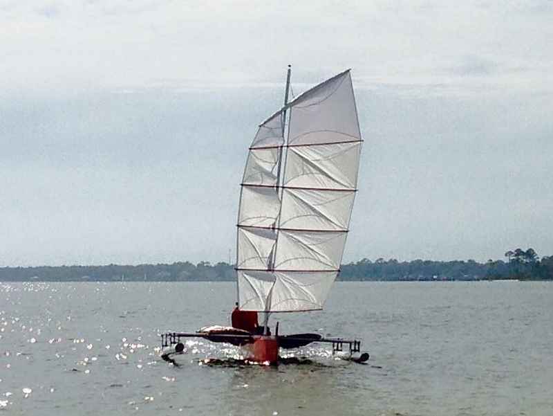 The prototype Little Tri used a Sunfish rig. While that works, I wanted something different and easier to single-hand while sailing in 20+ MPH winds normally found on the Texas 200 event. Junk rigs are known to be easy to handle with quick reefing and other advantages over conventional sloop rigs. The split junk rig I selected addresses the shortcomings of normal junk rigs while keeping the many advantages.
