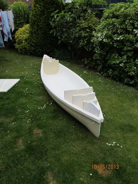 Fore and aft decks added (they stiffened up the boat wonderfully). A ¼ by ½ inch strip of oak (recovered from old kitchen cupboard doors) was bent using a hot air gun and glued in place to act as a backrest.