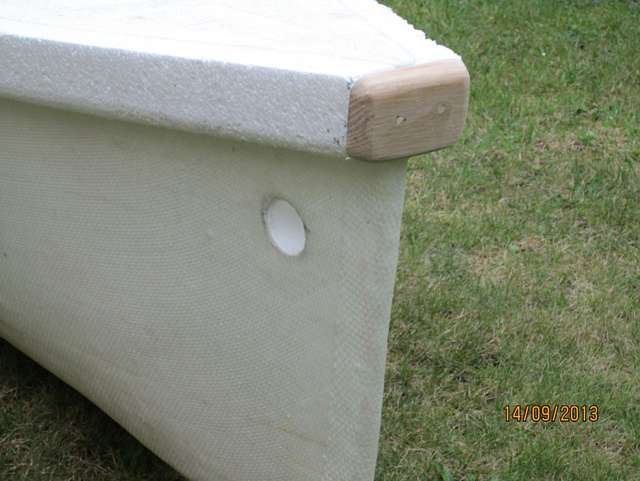 Expanded Polystyrene Foam (EPS) doesn’t have a great deal of compression strength (I seem to remember a figure of 7 grams per square mm, but don’t quote me). Even with glass cloth PVA bonded to is surface it will not withstand small point loads, the cloth ‘stretches’ and the underlying EPS compresses. The resulting loose cloth and ‘broken’ EPS takes in a little water in a sponge like fashion. This does dry out and the EPS does recover slightly after a day to two of dry storage, but it is never ‘as new’ again.