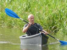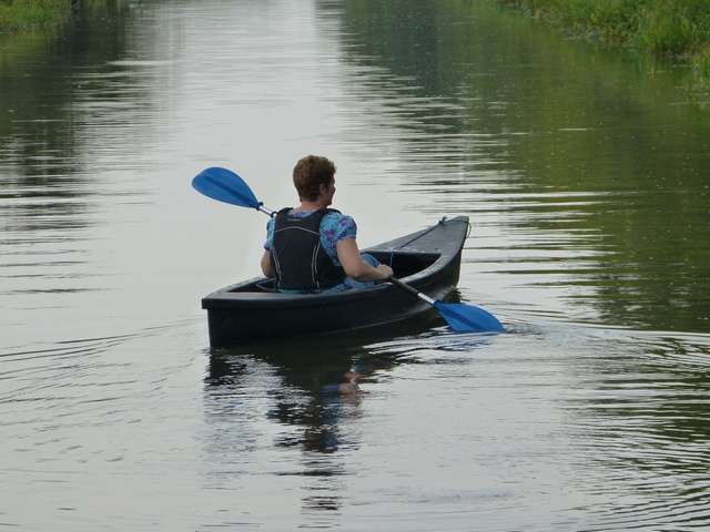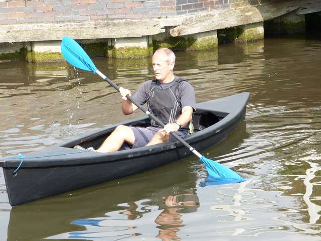 Well she’s had two reasonable outings so far: on both occasions I shoulder carried her the ½ mile to where a swing bridge crosses the canal, launched and paddled into the local town, which takes between an hour and 90 minutes depending on how many detours I take and how often I have to wait for the narrow boats. I’ve had one mishap – my own silly fault – I tried to limbo under a swing bridge and put all my weight on the oak strip backrest in a way that it wasn’t designed to withstand. It snapped, and it is now consigned to the bin. I’ve got a few ideas on the design of a MK2 back rest, but I’m in no hurry, she’s a pleasure to paddle even without it. An easy slow stroke with the double paddle, at a rate I could keep up for hours, propels her at a fast walking pace. Going faster is possible, but the extra effort required, along with all the water being splashed into the boat and over me, makes it undesirable. (If I’d wanted to go fast I’d have bought a K1 and spent months learning how to keep it upright.)