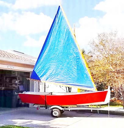 We took it out on a nice sunny day. The winds were 2 to 6 kts. With tarp homemade sails. I also made a make shift jib and used it at first to sail away from the launch. It worked after a fashion, but was not properly rigged, so we stored it. Another lesion learned.