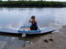I complete my secret paint job and test my kayak in a secret lab (swimming pool). A small leak in the forward module sends my craft back to area X. I hope another coat of secret sauce (paint) will cure my leaky front end. If not who cares, the pilot will be in the middle section. The middle module has pool noodle gunnels to soften any enemy radar and paddle strokes.