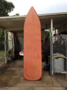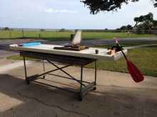 I went back to me sign making friend and ordered an 11'X32"X3" slab of styrofoam. I had figured a foot short and a 1/2 inch thinner than the prototype would still be more than enough to keep me afloat. In the same 8 hours or so I was able to cut it out and apply 2 layers of 6 oz fiberglass cloth to the new board. I had made the bow more pointed to part the waves and curved the aft corners instead of leaving them square. Otherwise, it was very similar to the prototype. I ended up opting for a fin system the simply straddled the board to it could be slip forward and used as lee-boards if I added a sail of some sort in the future. The fin system was easily removed for transport making the board in transportation-mode a simple flat slab with nothing protruding other than the PVC tie down system.