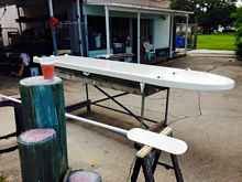 The finished board weighed just over 25 pounds without the removable seat & fin system. The board was large enough to support me and virtually impossible to flip in sit-down mode. It seemed slow but I'm not an SUP kinda guy so it is likely as fast as other SUPs which is disappointing for a sailor or motorboat guy (me). Still, in "sit-down" mode it is fast enough to explore the shoreline a bit even though I wouldn't want to have to paddle far upwind/against a current.