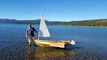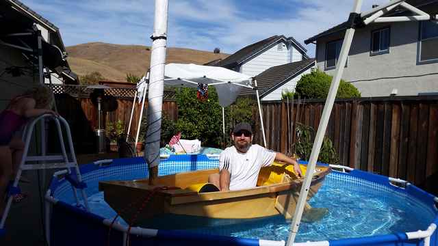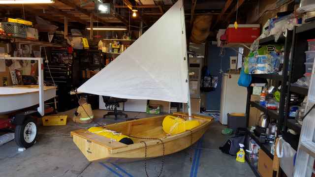 I was originally going to use the old 12 foot mast from my Mixer with a 55 square foot leg-o-mutton sprit sail. But when I put the boat in my pool and slotted the mast in place, the weight of the mast pulled the whole boat over on its side. With my 60 pound eldest son acting as ballast, it balanced ok, so I was more or less ok with it. A recent capsize of my Mixer has knocked some sense into me though, so I switched strategy and I’m starting with a tiny 8 foot mast and 21 square foot leg-o-mutton sprit sail. Even the skateboard crowd have rudimentary learning capabilities when given adequate stimuli.