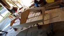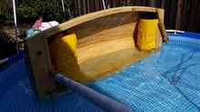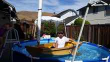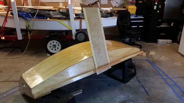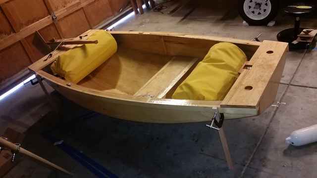 I thought long and hard about adding bulkheads and decks. Michalak’s hand-wavy “use foam blocks when sailing to avoid swamping” gave me some mild nightmares. I just didn’t want to add all that extra weight, and void the whole point of the boat. Instead, I made some cleats out of excess gunnel material. I bought two very nice 55L dry bags. I bulk out the dry-bags with balloons, fasten them tight, and lash them into the bow and stern. I tried it in my backyard pool, it works well.