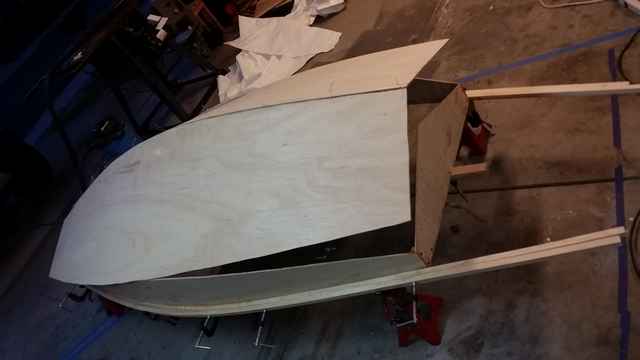 When the plans arrived, I started immediately. I got the plywood home on the top of my SUV, somewhat against relevant vehicle code. I had it marked out within the half hour, did a terrible job with the jigsaw holding the sheets on a thigh, at one point resting a lose end on my forehead. Skill – epoxy cures all – a few little wavy bits don’t matter (see why I didn’t tackle the lapstrake now?). Within the first evening I had all the major panels cut out and the framing on.