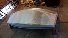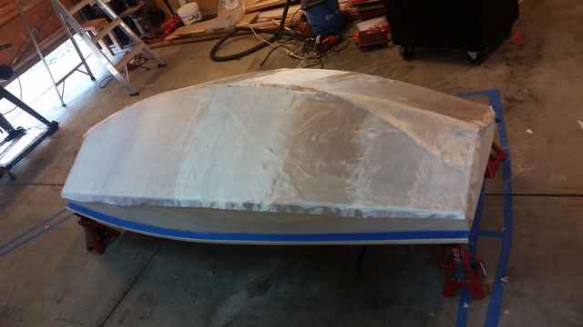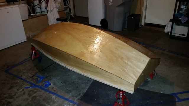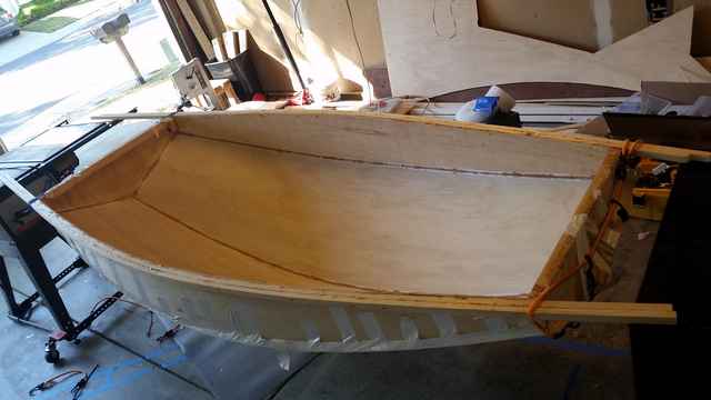 I’d seen an episode of “How Its Made” about making CLC canoes, and I’d seen them apply a very neat bead of thickened epoxy straight onto a plywood joint – none of this “wetting out” nonsense. I copied them using a pastry bag (thanks wifey!) and very exceptionally happy with the results. The seams on my Mixer were a long, drawn out, incredibly messy affair taking a whole weekend. On the Weevee, about 1.5 hours. I used 1 inch fiberglass tape – because it was only 8 bucks a roll from Amazon – but I used two layers on all inside seams. Outside I used the fiberglass cloth leftover from the Mixer job (I had plenty left over because of a brain-fart in the whole yards-versus-feet affair).