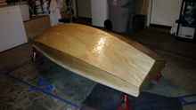 Outside the hull I also didn’t wet out first – I put on the glass then drenched it in resin, smoothing it as best I could. It all turned out drippy and runny, but the glass was firmly on, the bits all attached together, and I was happy – only 4 evenings I think to this point. I think I had this goal of building it in less than 20 hours, to less than 100 dollars. The hull just squeaked in under that, the rig took a few hours longer (the rudder and leeboard took a day or so each, I think). However, I decided early on I wasn’t even going to bother trying to “fair” it. I spent about 35 hours on my Mixer purely on what I termed “sanding and fairing” in my log – time wasted in my opinion – it looks rough as hell close up – but the thing is, I don’t care in the slightest. I decided for this boat I wasn’t going to paint it, just varnish it, warts and all. It even has the pencil lines marking out the stations visible on the bottom. To me it just adds character.