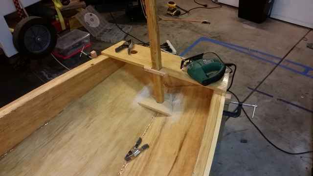 - The mast partner hole in the bow pad was cut exactly one half-inch too far to the right. I don’t know how I did it, but I only noticed when I was squaring up the epoxy-covered, fiberglass-tape-goopy mess that holds the mast step in place. I couldn’t be bothered to backtrack and fix it, so I gooped it upright where it sat and lamented my mistake with a beer. I rationalize: the boat is called Doctor Weevil, you have to expect weird stuff like that.