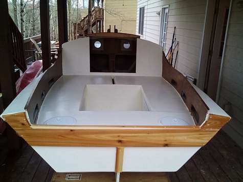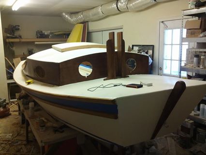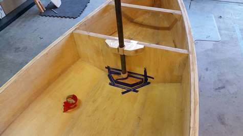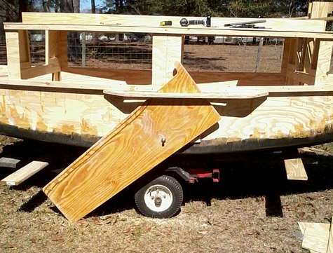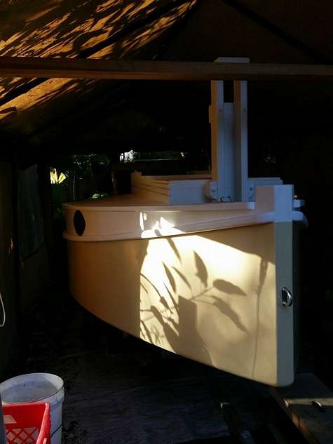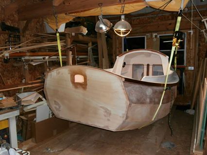 Riddle: can one person turn a SCAMP? Got a couple of 1500 lb test tie downs and lifted it just high enough to dismantle the building base. At this point, the boat probably weighs a bit over 300lbs, so not too bad.