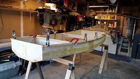 Progress on my Mixer... This weekend I got the external seams filled with thickened epoxy and covered them with fiberglass tape, which was easier than the internal epoxy work. Then I did the first lamination of the gunwales, and some sanding. Decided I'm going to encapsulate with epoxy all over, so bought more of the gunk. It'll get its second lamination of gunwales next weekend, and though the week I'll try to squeeze in some sanding. Always more sanding. Really starting to look like a boat.