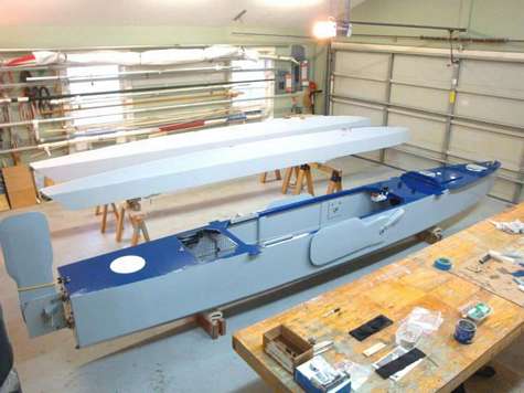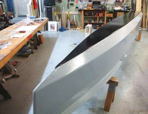 The 'Slingshot 19' gets a full refurb, complete with a graphite-epoxy bottom treatment and a new two-tone paint job! After a couple years of hard use and outdoor storage, it was definitely time for some touch-up. More pics on Facebook.