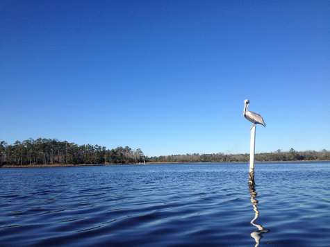 On Monday afternoon at approximately 12:34 ET Laura and I set out on what we thought would be an ordinary perusal of the inlets and creeks of the area... With a superbly hand built kayak of vibrant color, we set of into the sun with minimal trouble. As this beautiful craft glided over the frigid water, we marveled at its stupendous craftsmanship. After some time had elapsed, we spied a pelican upon a channel marker in the distance. A half hour of careful, quiet paddling later, we neared the majestic winged beast close enough the snap a glorious photograph with my iPhone. However, our enthrallment in the bird caused us to overlook the fact that the tide was falling and we were being spirited away towards shallow waters. By the time that our situation came to my attention, our window of escape had passed. We had run aground...
