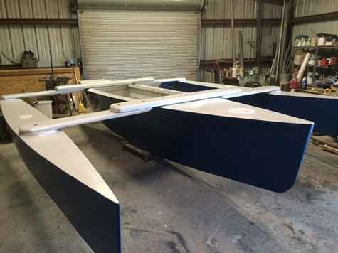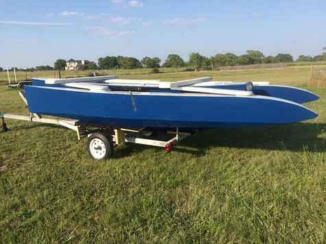 Today was the rollout of the shop for Sail52 of the Seaclipper 16. Built to plan with open cockpit design, daggerboard and swing wing amas. Will be rigged with a Hobie 14 rig (still to be purchased.)