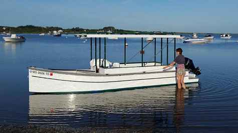 I built Bantam and Grinder, both modified Phil Bolger designs. Grinder turned out very well, but I thought I could do better. My idea was to build a boat similar to Grinder, but much lighter, with a different profile and a bit longer cabin. Since a flat bottom boat gains efficiency as it loses weight, I wanted to try a smaller engine that needed less battery, all Okume construction, a laminated 3/4" hull, and get rid of the heavy shoe Phil had on the clam skiff. I changed the sheer line to something I liked, eliminated the raised coaming of Grinder, and added an extended gunwale to stop spray and provide a walkway and seating all around the boat. The construction pretty much follows the method I used on Grinder.