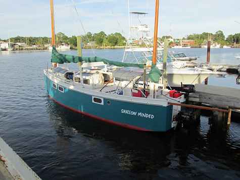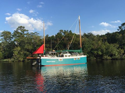 Shallow Minded at anchor in St. Marks with her delta wing riding sail that I made for Belle.