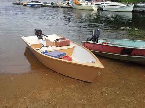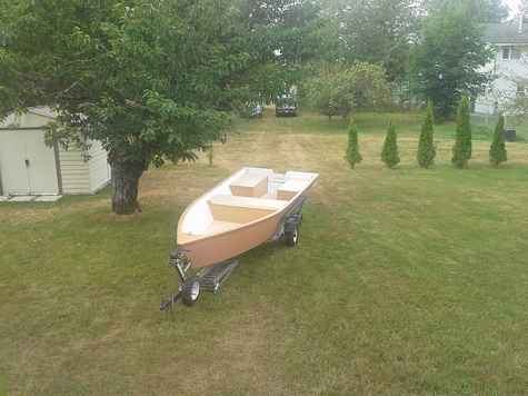 I built a Duckskiff from construction grade plywood and low grade lumber, a first effort at stitch and glue construction. The bottom and sides were made by butt joining two sheets of plywood as per Dynamite Payson. The required "kit" was then cut from the 8 X16 plywood. I used a combination of plastic tie straps and duct tape to hold the boat together while spooning the epoxy 'butter" in the joints as required. The boat was covered with six ounce cloth inside and out, two layers on the bottom. Since the wood is lower grade and not that pretty, I painted it with "Brightsides" oil paint. She gets an early 1990's Two stroke Mercury 9.9 outboard I've had since new. She comes up on plane nicely and as expected pounds in the rough. I'll be using her on the Skeena River for Salmon fishing as I don't hunt.